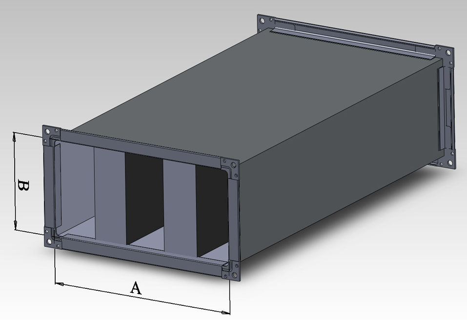 Прямоугольные шумоглушители применяются в вентиляционных системах с воздуховодами аналогичного прямоугольного сечения. При помощи звукопоглощающих материалов они снижают аэродинамический и механический шум, возникающий во время работы вентиляции, а также не дают ему распространиться по воздуховодам.