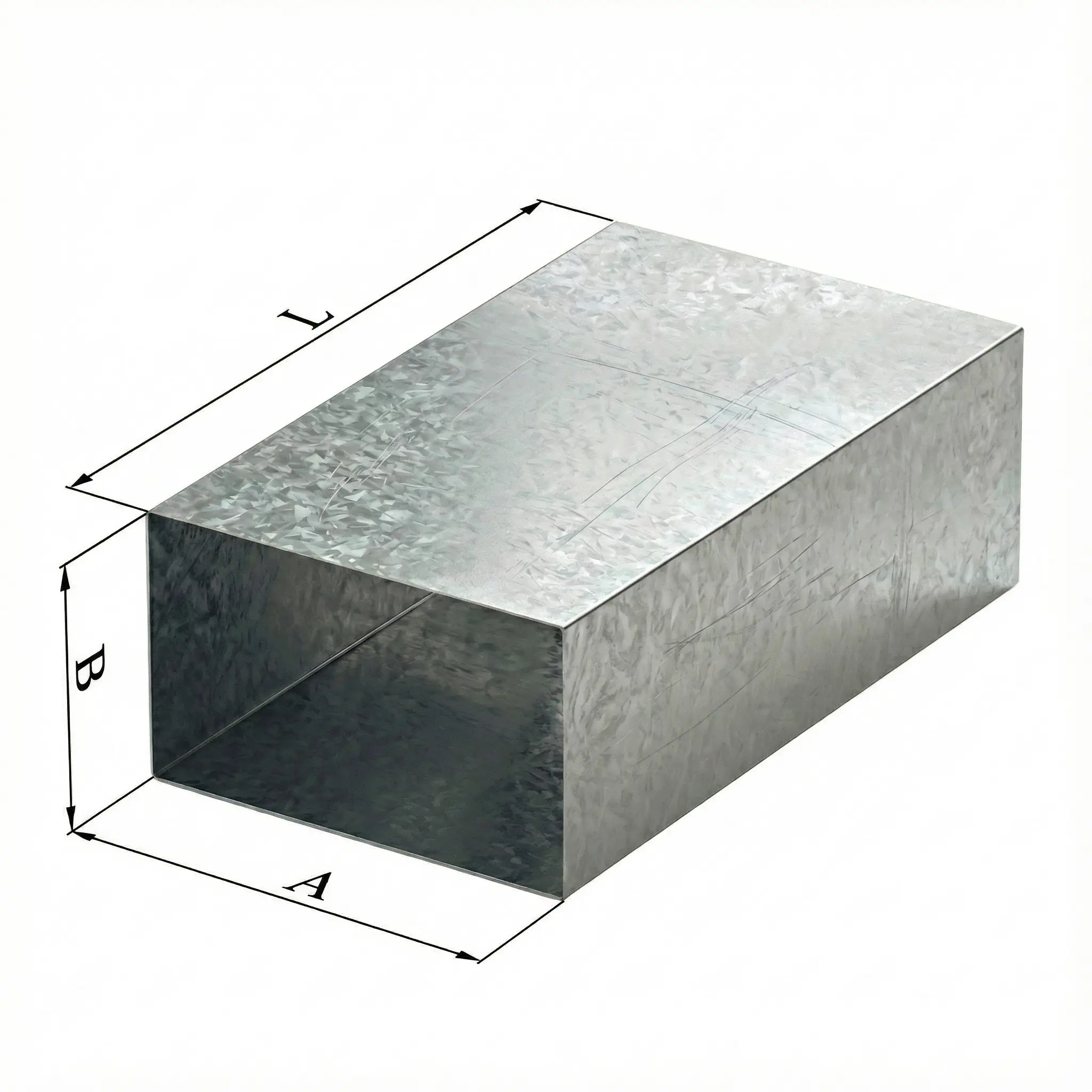 Прямоугольный воздуховод для вентиляции представляет собой короб из оцинкованной стали. Это прямой участок длиной до 1250 миллиметров. Длина и ширина сечения подбираются исходя из расчетов проекта вентиляции индивидуально для каждого конкретного случая. Соединение с соседними элементами сети осуществляется фланцевым способом. Чаще всего для изготовления воздуховодов применяется листовая сталь толщиной от 0,5 до 1 миллиметра. Чем больше размеры сечения, тем толще должны быть стенки изделия.