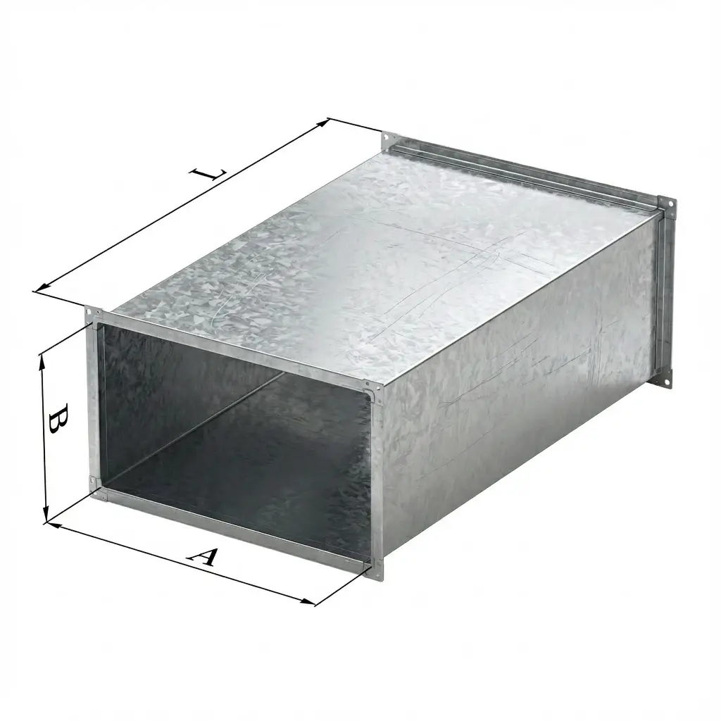 Прямоугольный воздуховод для вентиляции представляет собой короб из оцинкованной стали. Это прямой участок длиной до 1250 миллиметров. Длина и ширина сечения подбираются исходя из расчетов проекта вентиляции индивидуально для каждого конкретного случая. Соединение с соседними элементами сети осуществляется фланцевым способом. Чаще всего для изготовления воздуховодов применяется листовая сталь толщиной от 0,5 до 1 миллиметра. Чем больше размеры сечения, тем толще должны быть стенки изделия.
